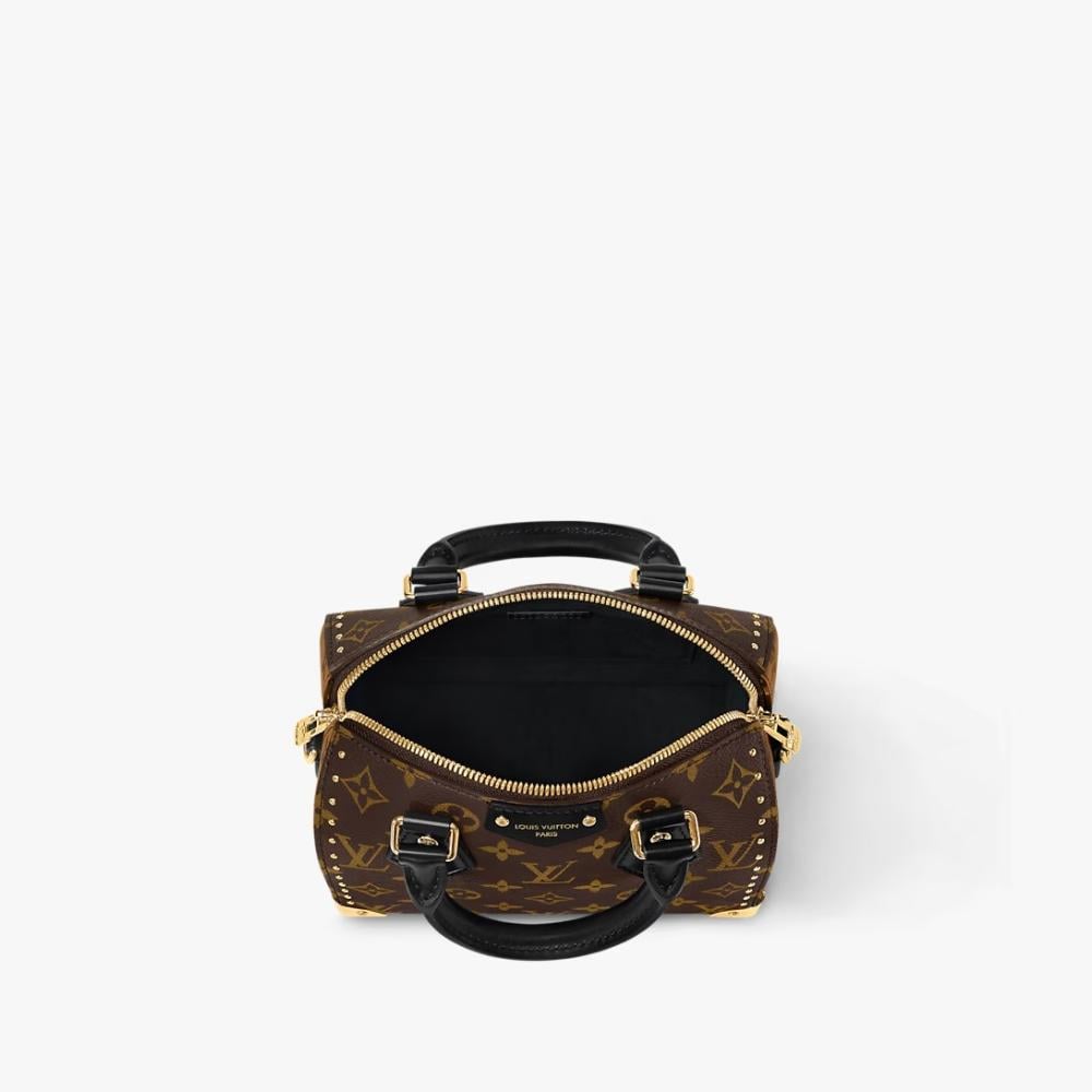 تأتي حقيبة Speedy Trunk بإعادة تصميم جريء تم تقديمها ضمن عرض أزياء Cruise 2025. تتميز بلمساتها المستوحاة من صناديق السفر التراثية بلمسات ذهبية أنيقة. صُنعت من قماش Monogram الأيقوني مع زخارف Monogram Reverse المتباينة، مما يعكس توقيع المصمم نيكولاس غيسكيير. تأتي الحقيبة بحزام وسلسلة قابلين للإزالة، مما يتيح حملها بطرق متعددة: عبر الجسم، على الكتف، أو باليد.