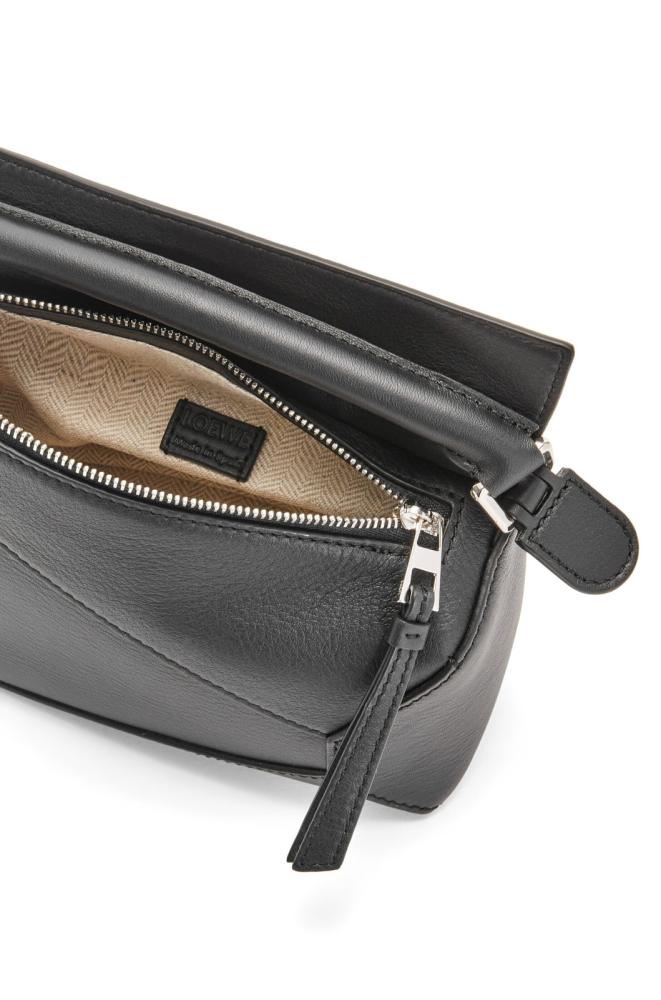 حقيبة Mini Puzzle من Loewe مصنوعة من جلد العجل الكلاسيكي، وتتميز بتصميمها الهندسي الفريد الذي يعكس الحرفية العالية للدار. تأتي بلون الاسود مع تفاصيل دقيقة، مما يضفي عليها طابعًا عصريًا وأنيقًا. يمكن حملها بعدة طرق، بفضل حزام الكتف القابل للتعديل، مما يجعلها خيارًا مثاليًا للإطلالات اليومية التي تحتاج إلى لمسة من الأناقة والابتكار.