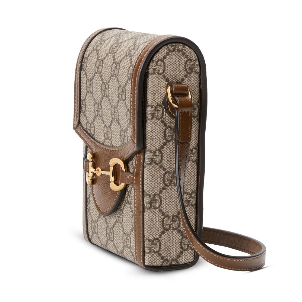 • حقيبة Gucci Horsebit 1955 مستطيلة الشكل بحجم صغير ومثالي، مصنوعة من قماش GG Supreme البيج والأبنوس الأيقوني الخاص بالدار.
